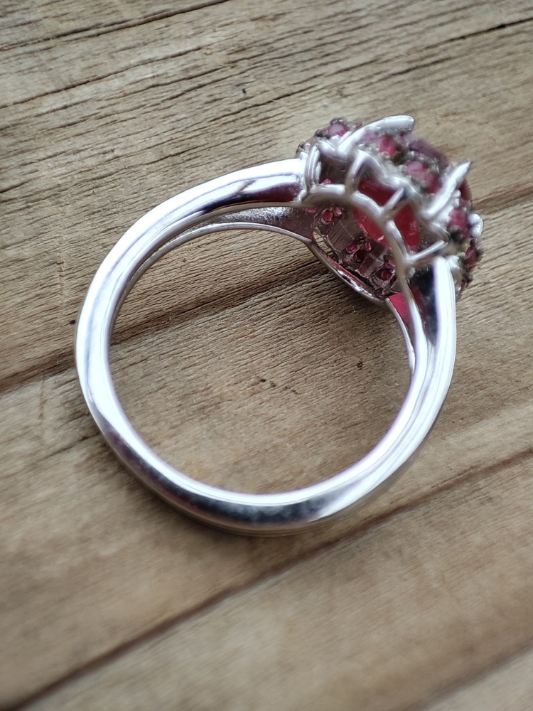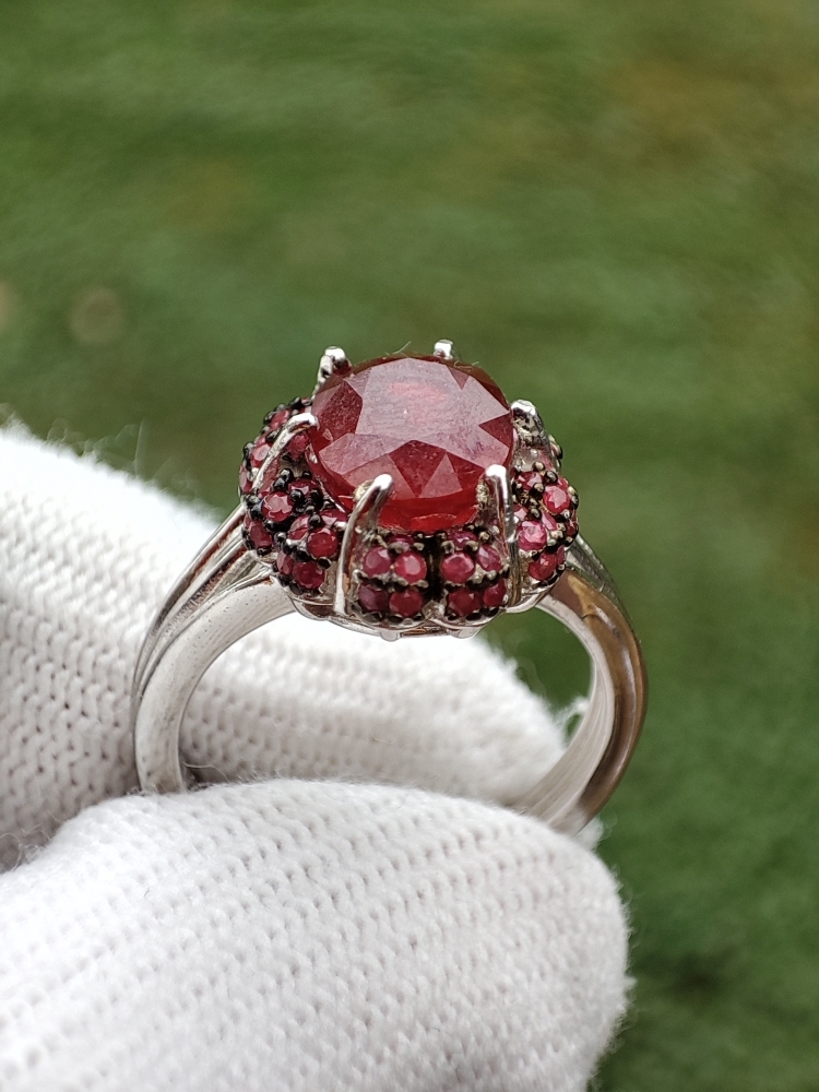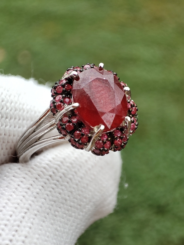 Inel argint cu rubin rosu de sange oval, fatetare de diamant 9 x 7 mm