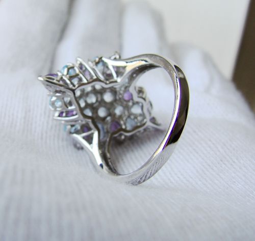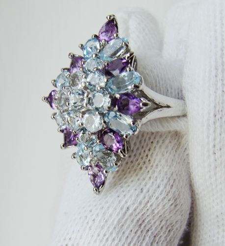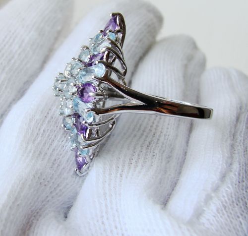 fermecator inel cu topaz albastru ca cerul si amethist purpuriu de origine brazilia forma pietrelor: oval si rotund