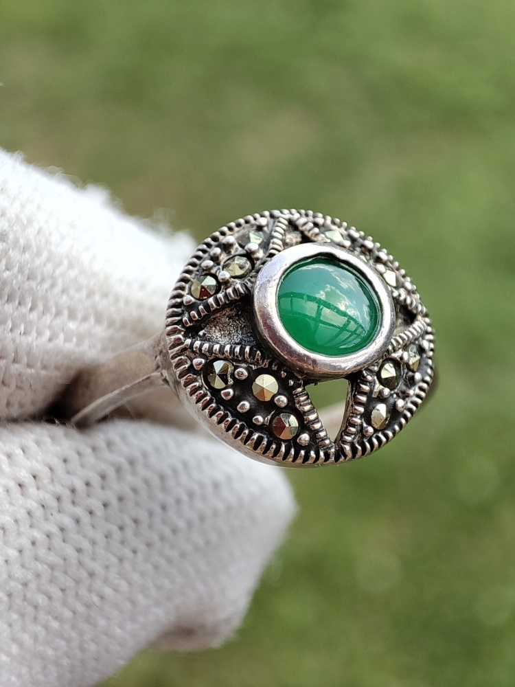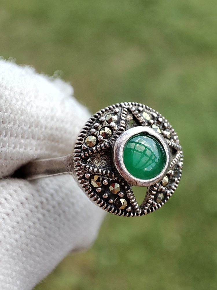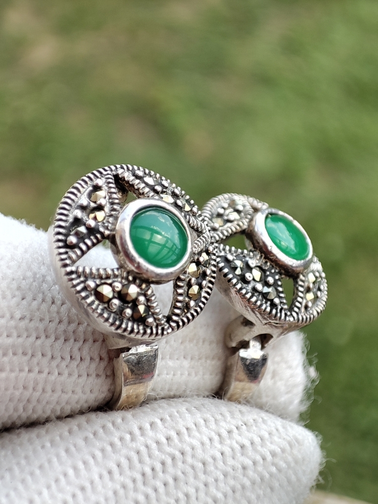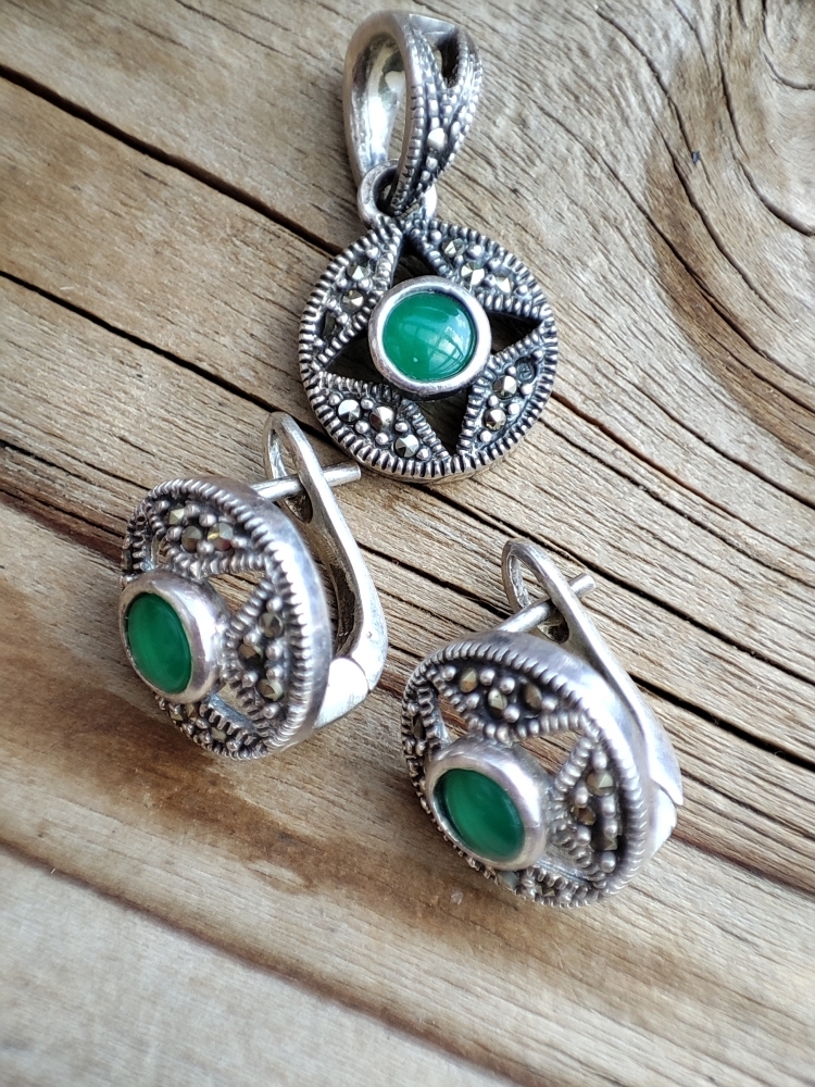 925 set argint cu aventurin verde rolex cuprinde inel foarte frumos natural cabochon de origine Brazilia masura 14. 5 gramaj 3.5 g diametru interior 17.2, medalion 2.41 g, cercei 4.23 g, montura 12 mm