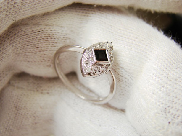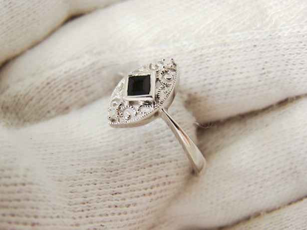 filigran model englezesc marcat GL Birmingham Dia pentru diamante si panson atelier an 1960 cu safir central scuare cut albastru opac inchis doua diamante anturaj 0.03ct. montura aur alb 9k gramaj 1.63g. masura 54.5 diametru interior 17.1mm