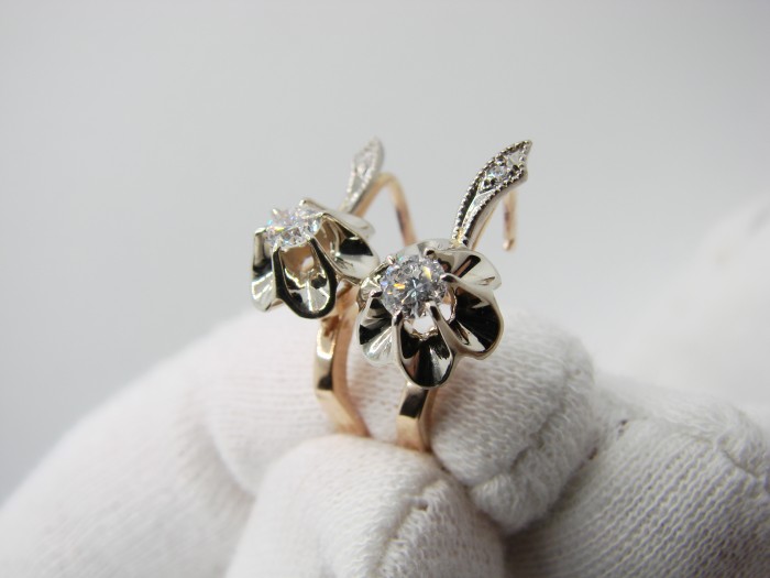 Acești cercei din aur alb și galben de 14 k sunt creați într-un design rusesc unic, totalizând 4 diamante autentice cc. 0.45 ct.