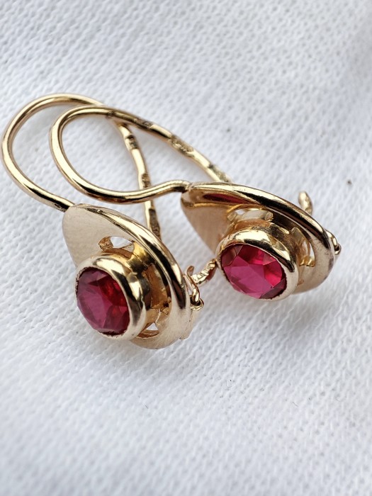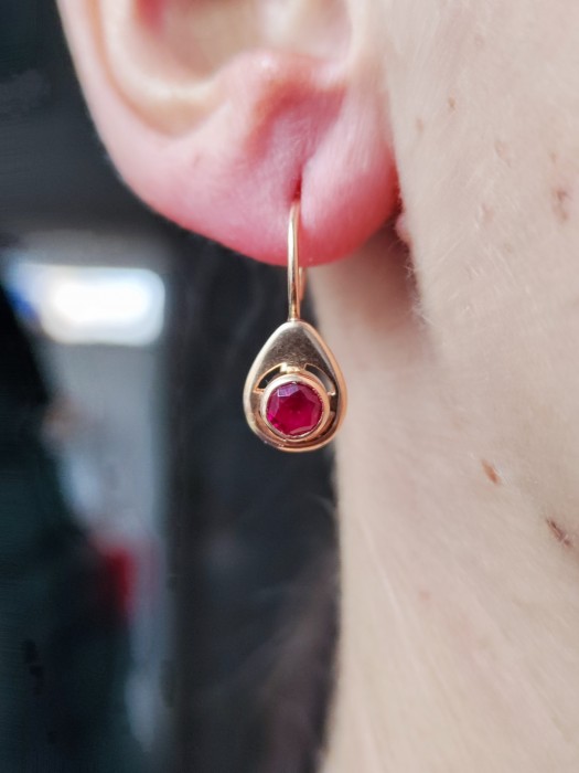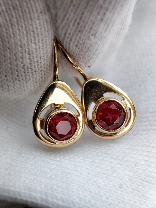 Cerceii sunt realizati din aur 14K 583 rusesc, avand un design retro traditional si sunt ornamentati cu rubelit. O bijuterie eleganta si rafinata potrivita pentru orice ocazie speciala.