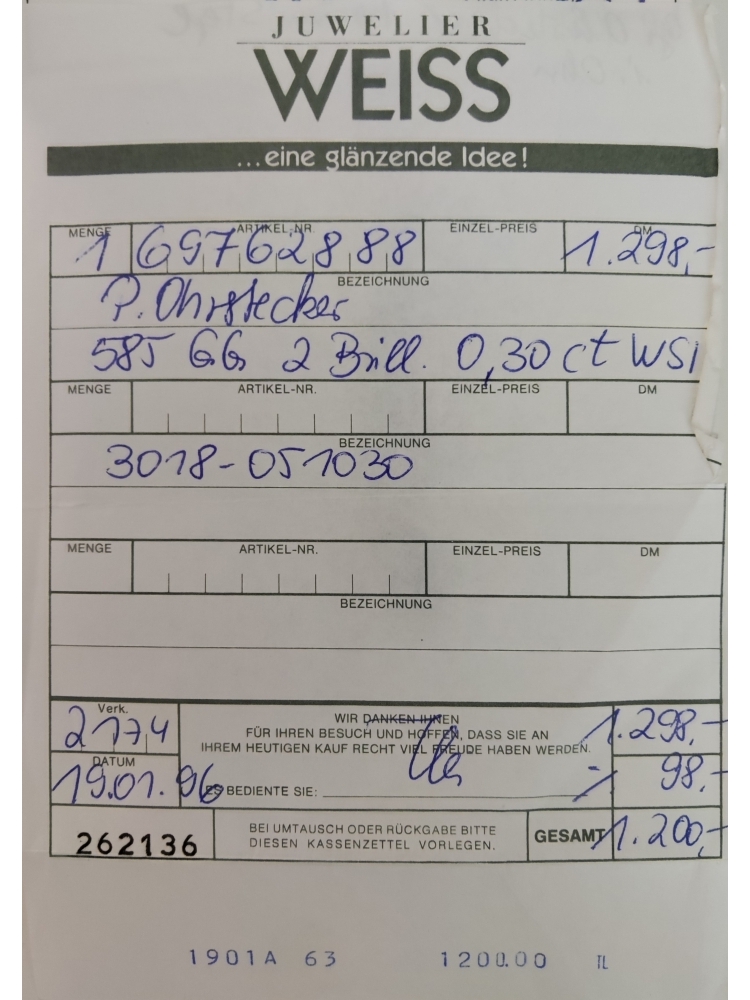 pentru cercei exista bonul fiscal original din anul 1996 pret evaluat la 2174DM si sau vandut cu 1200DM conform documentului
