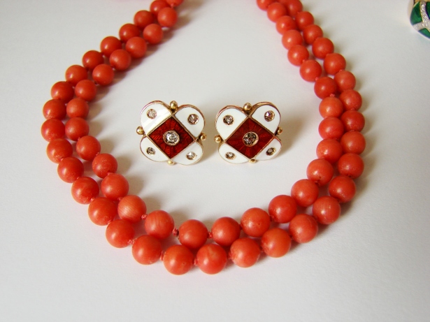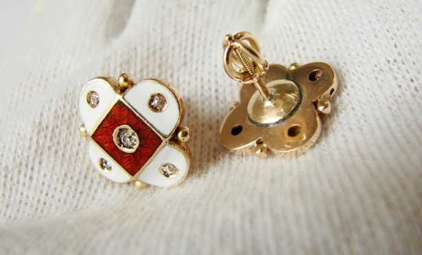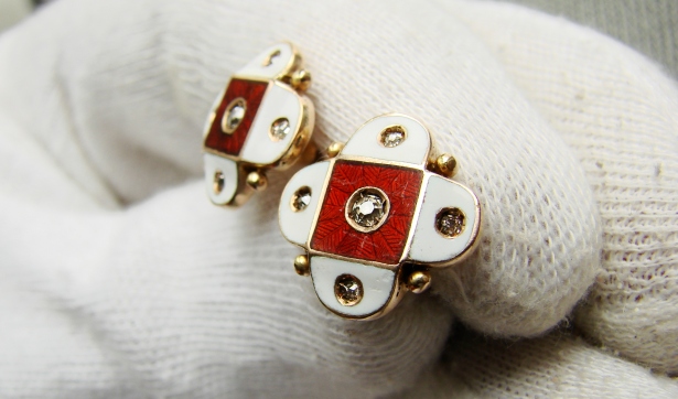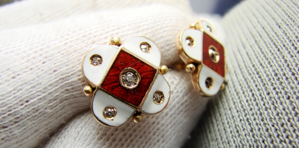 Remarcabila lucrare contine renumita tehnica de emailare tip champleve alb opac si rosu inchis caramiziu translucid .