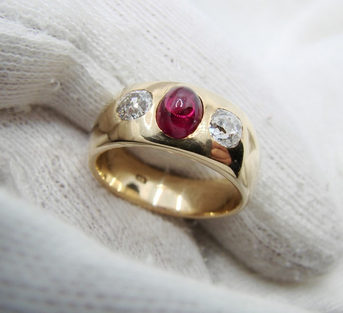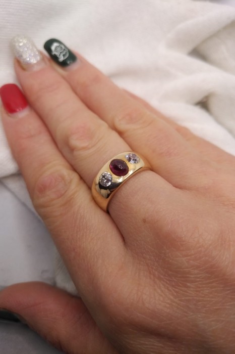 Un inel charismatic Victorian deosebit de frumos cu o turmalina rara visinie de rubelit naturala si doua diamante uriase old european cut montate manual in aur masiv aliat intre 16K si 17K .