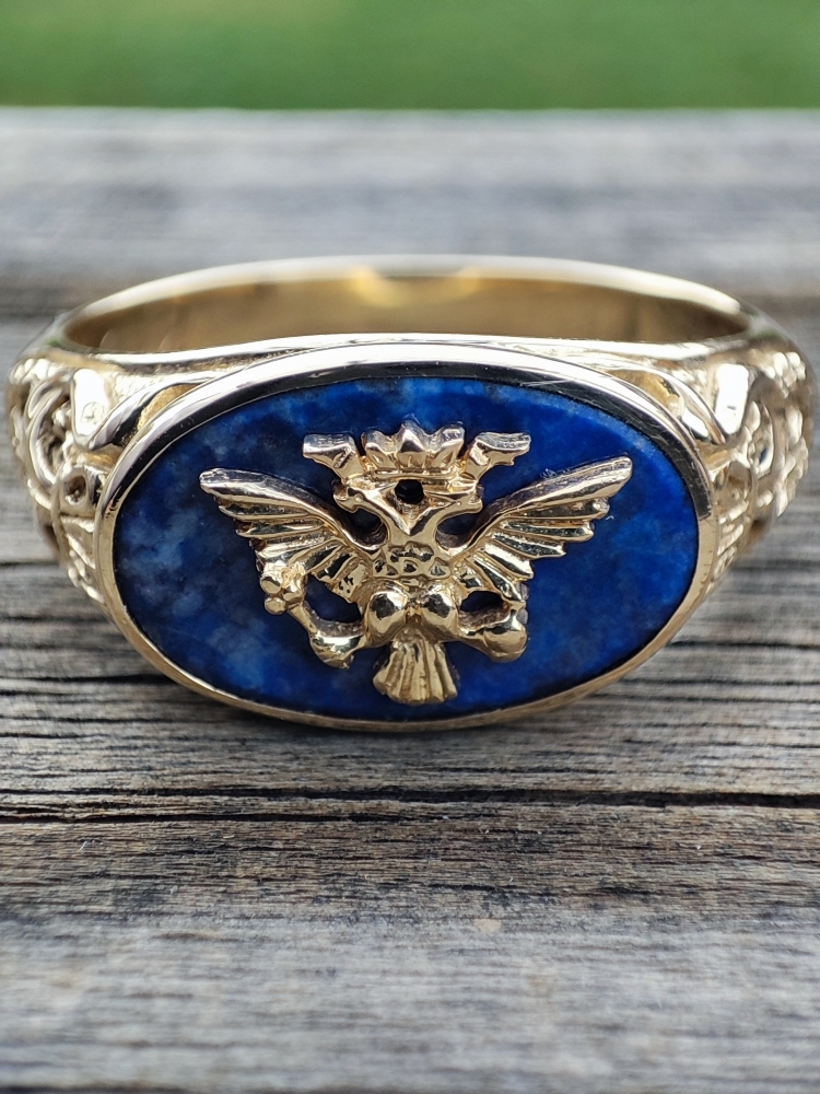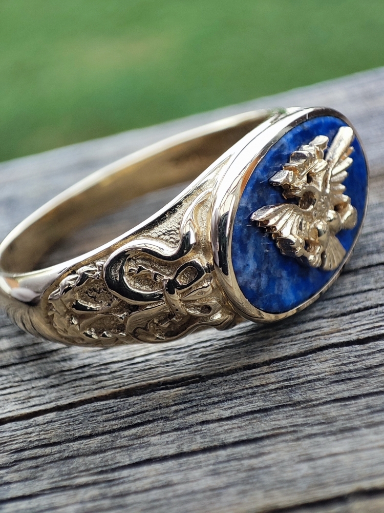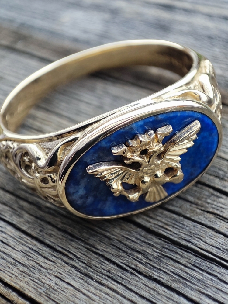 This Imperial Eagle Ring is an original design by The House of Igor Carl Faberge - Geneva. It was originally available way back in 1985 through the Franklin Mint. Quite scarce now and rarely ever listed for sell.The deep blue Russian Lapis is natural and untreated (no heat, no chemical, no dye). Great detail of the double-headed imperial eagle clutching scepter and orb in talons .