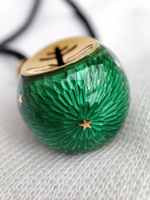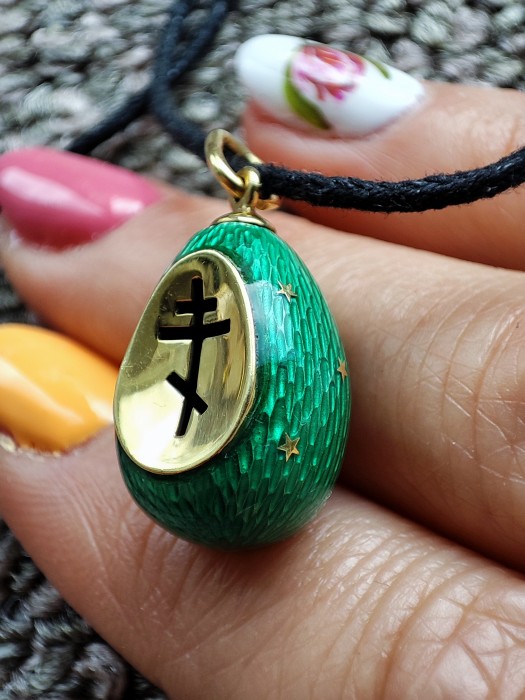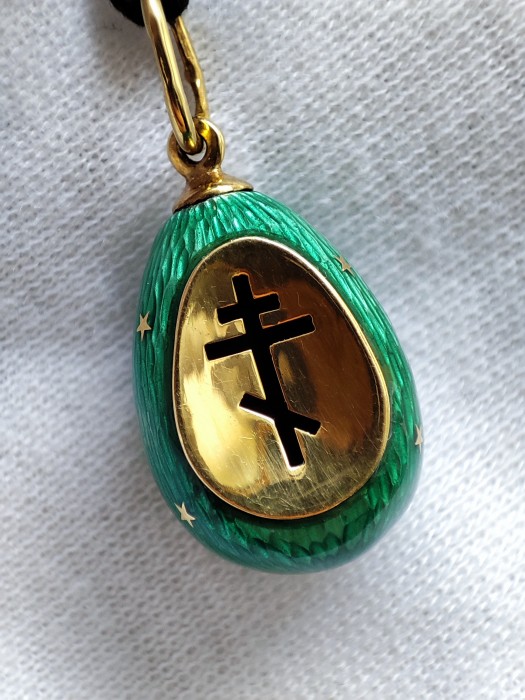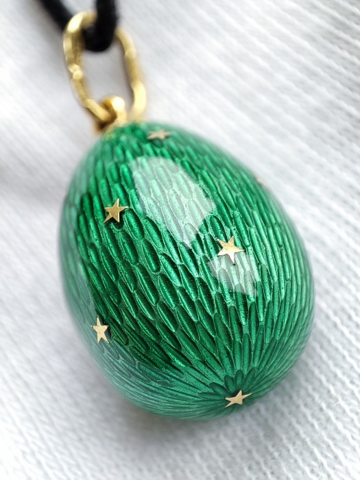 Un pandantiv în formă de ou executat cu măiestrie - care amintește de calitatea faimoaselor ouă Faberge fabricate în Rusia Imperială - cu email guilloche de un verde intens cu stele aurii încrustate si crucea religioasa slava ortodoxa .