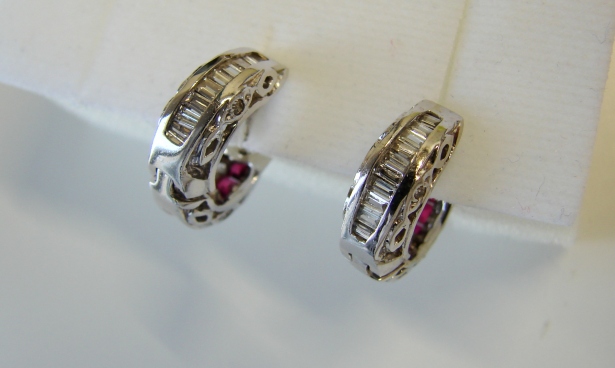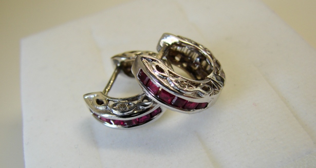 cercei de lux unicat cu rubine princess cut rosu sange de porumbel, cea mai buna calitate 12 buc a cate 2x2 mm circa 1.2ct.