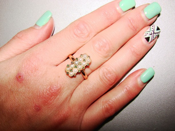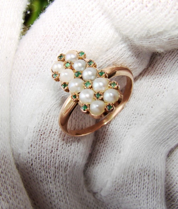 Un inel fermecator victorian cu perle gri si smaralde naturale